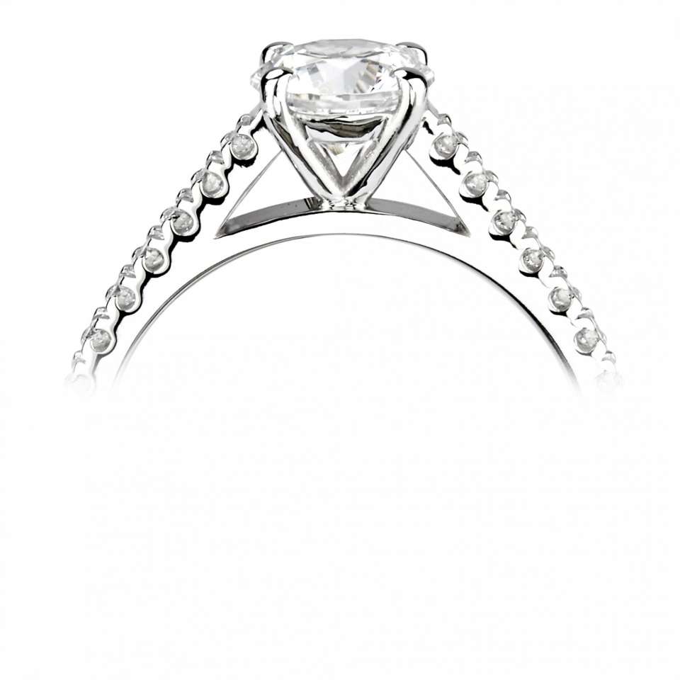 A classic four claw round solitaire with diamond set shoulders. Narrower shoulders, lower melee carat weight than R1-2206B.