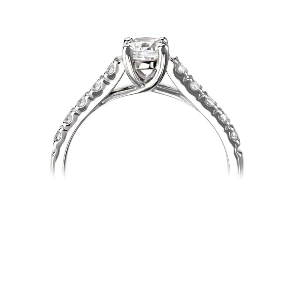 A classic crossover four claw round solitaire with diamond set shoulders.