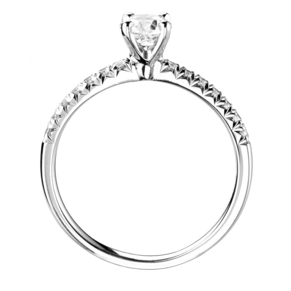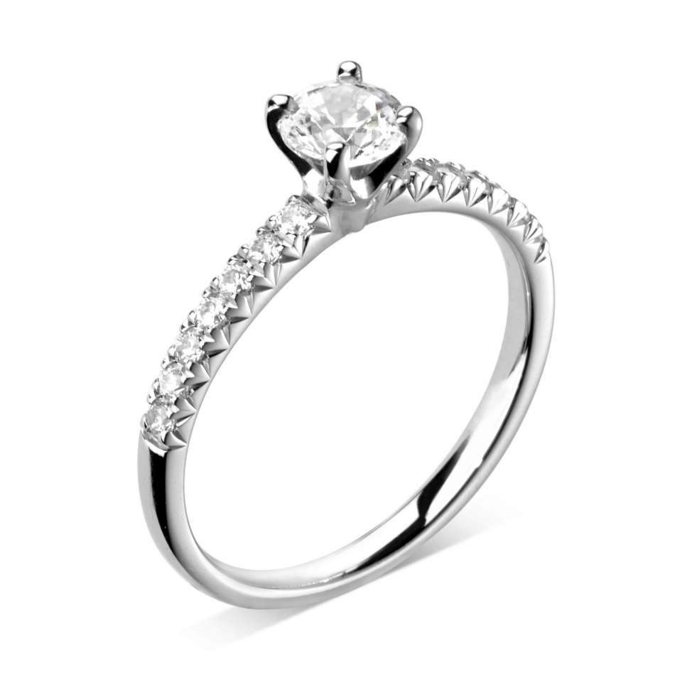 A modern four claw round solitaire with fishtail set diamond shoulders.